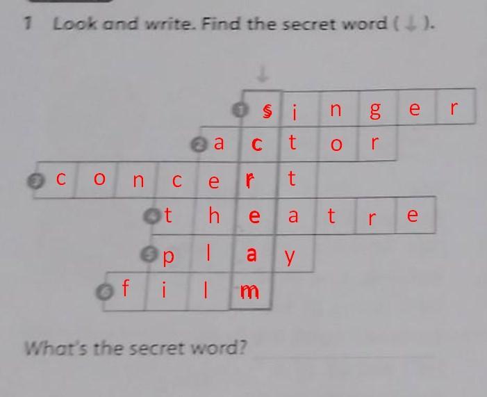 1) Певец 2) Актёр 3) Концерт 4) Театр 5) Пьеса 6) Фильм = КРИЧАТЬ