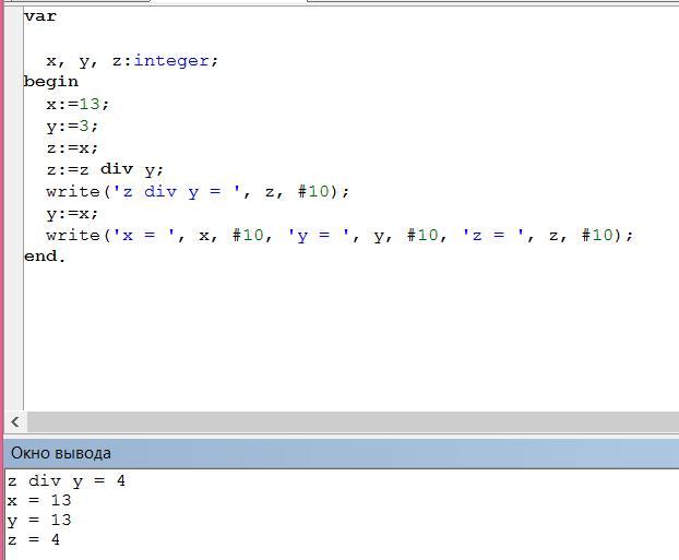 Изначально в переменной x хранится значение 13, в переменной y хранится значение 3. Переменной z присваивается значение x, т.е фактически в переменную z записывается значение 13.
