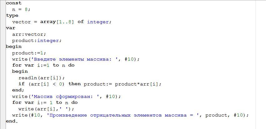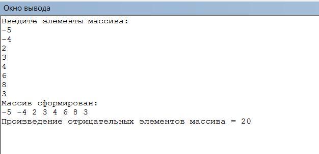 вывести массив на экран в одну строку и найти произведение отрицательных элементов массива