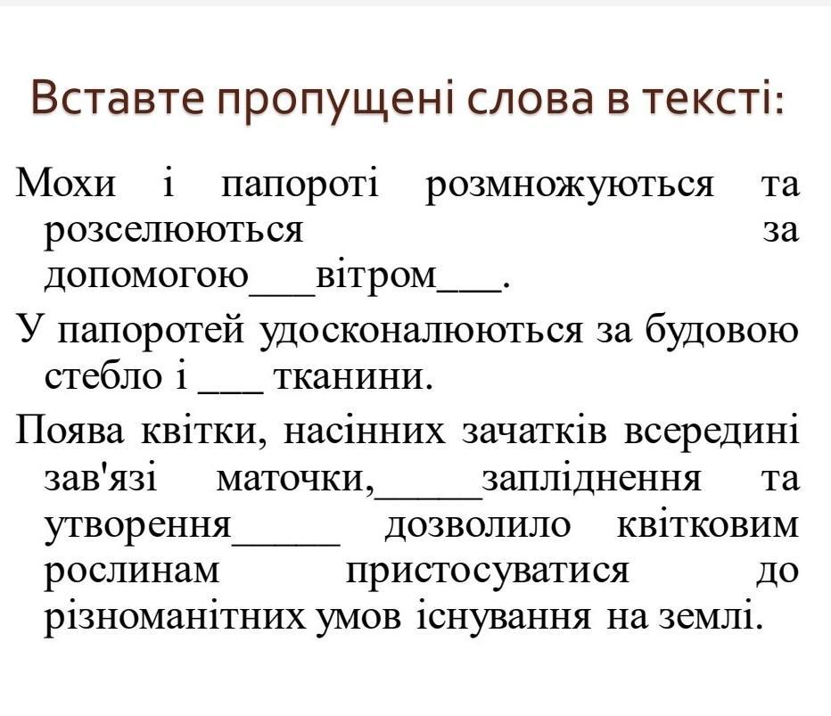 1.Мохи і папороті розмножуються та розселюються за допомогою перенесенням вітром спор.