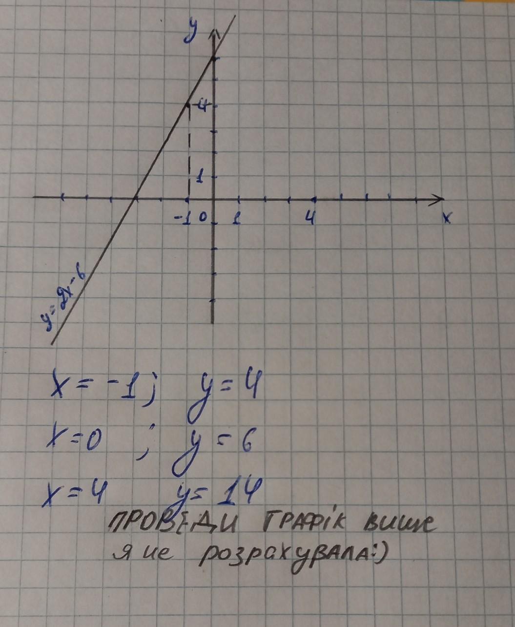 побудуйте графік функції y=2x-6. користуючись графіком знайдіть; значення функції якщо значення аргументу дорівнює 4, -1, 0