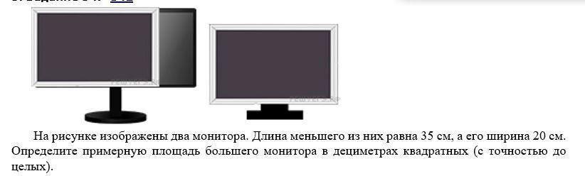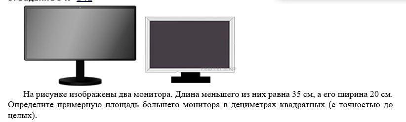 На рисунке изображены два монитора. Длина меньшего из них равна 35 см, а его ширина 20 см. Определите примерную площадь большего монитора в дециметрах квадратных (с точностью до целых).
