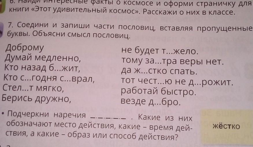 1.Доброму везде добро. 2.Думай медленно ,а работай быстро. 3.Кто назад бежит, тот честью не дорожит. 4.Кто сегодня соврал, тому завтра веры нет. 5. Стелет мягко да жёстко спать. 6.Берись дружно не будет тяжело..