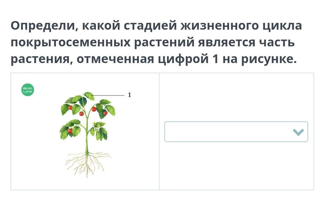 Определи, какой стадией жизненного цикла покрытосеменных растений является часть растения, отмеченная цифрой 1 на рисунке.