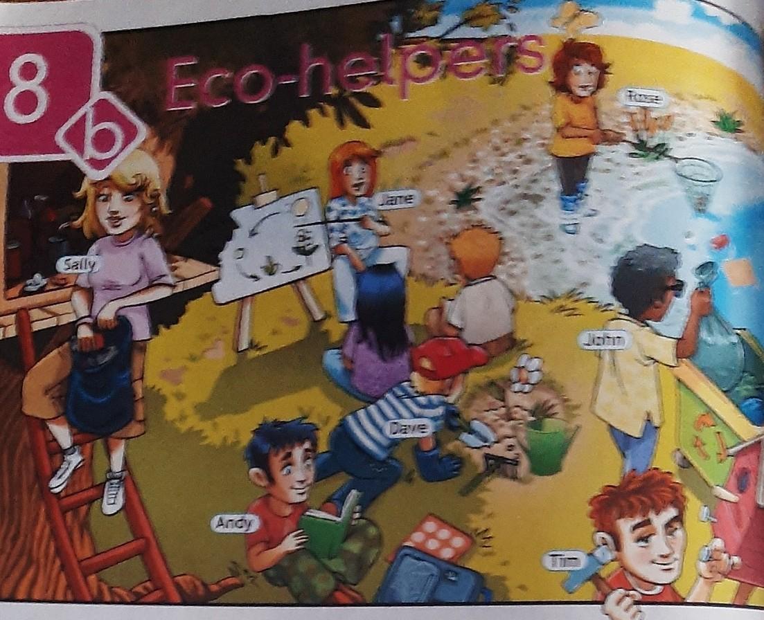 3. Sally is wearing a pink T-shirt and brown pants. She collects trash from the tree house.
