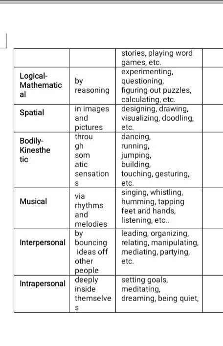 Task 2. Look at the table below and fill in the needs in accordance with the type of intelligence. The Seven Multiple Intelligences in Childrenstories, playing word games, etc. experimenting, questioning, reasoning figuring out puzzles, calculating, etc. designing, drawing, visualizing, doodling, etc. dancing, running, jumping, building, touching, gesturing, etc. singing, whistling, humming, tapping feet and hands, listening, etc.. Logical- Mathematic al by in images and Spatial pictures throu Bodily- Kinesthe gh som tic atic sensation via Musical rhythms and melodies by Interpersonal bouncing ideas off leading, organizing, relating, manipulating, mediating, partying, other people deeply etc. setting goals, meditating, themselve dreaming, being quiet, Intrapersonal inside срочна керек болып тұр жазып жеберіндерші пжжжжжжжжжжжжжжжжжжжжжжжжжжжжжжжжжжжжжжжжжжжжжжжжжжжжжжжжжжжжжжжжжжжжжжжжжжжжжжжжжжжжжжжжжжжжжжжжжжжжжжжжжжжжжжжжжжжжжжжжжжжжжжжжжж