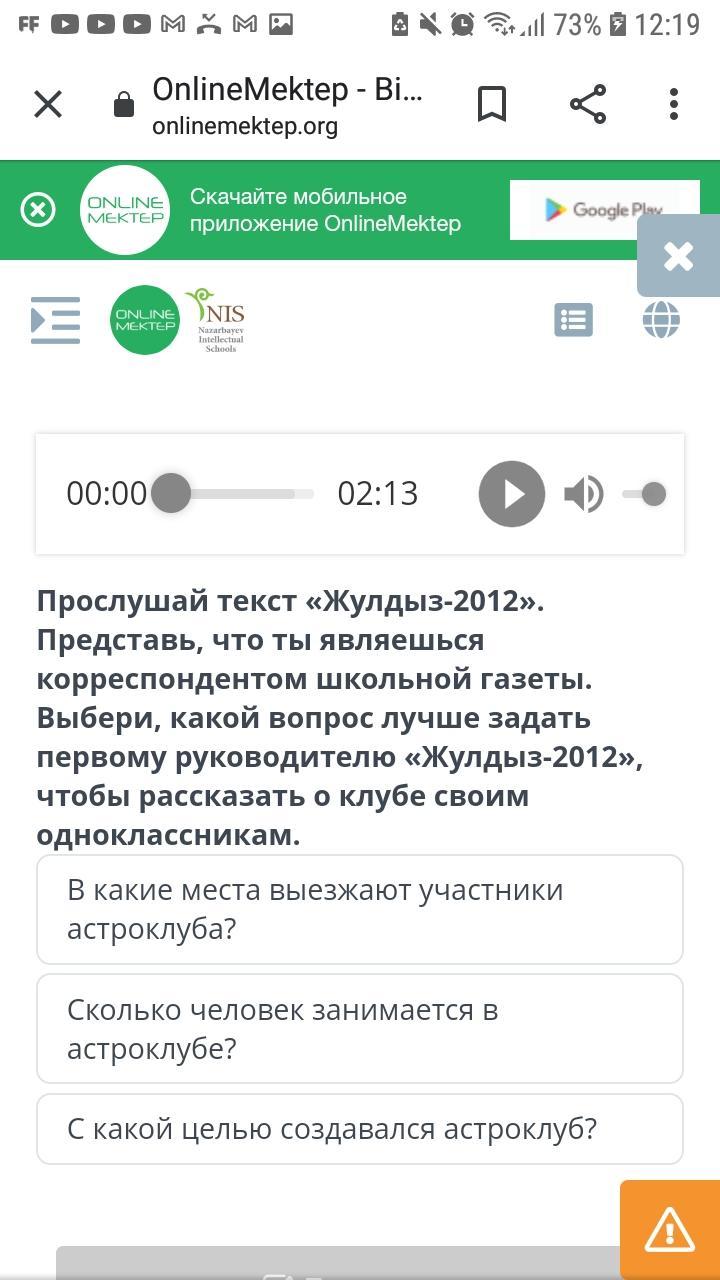 Прослушай текст «Жулдыз-2012». Представь, корреспондентом школьной газеты. что ты являешься Выбери, какой вопрос лучше задать первому руководителю «Жулдыз-2012», чтобы рассказать о клубе своим одноклассникам. В какие места выезжают участники астроклуба? Сколько человек занимается в астроклубе? С какой целью создавался астроклуб?