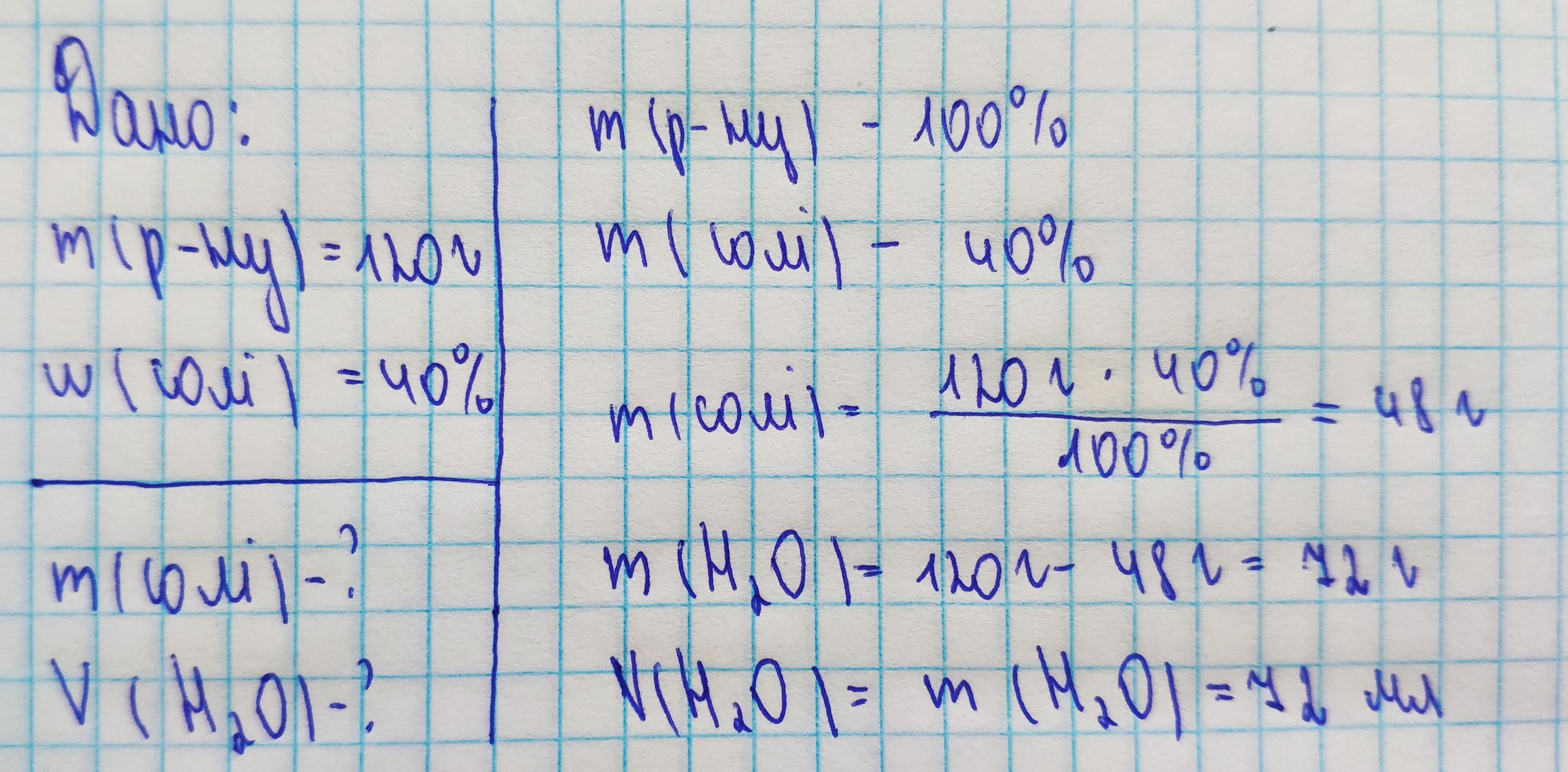 Приготували 120г розчину де масова частка солі становить 40%. Скільки грам солі і який об'єм води в приготовленому розчині