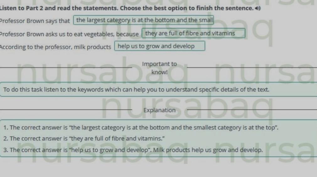 Listen to Part 2 and read the statements. Choose the best option to finish the sentence. Professor Brown says that Professor Brown asks us to eat vegetables, because According to the professor, milk products