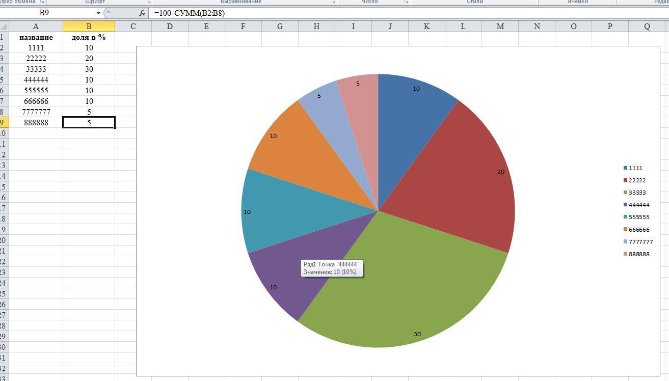 =100-СУММ(B2:B8)