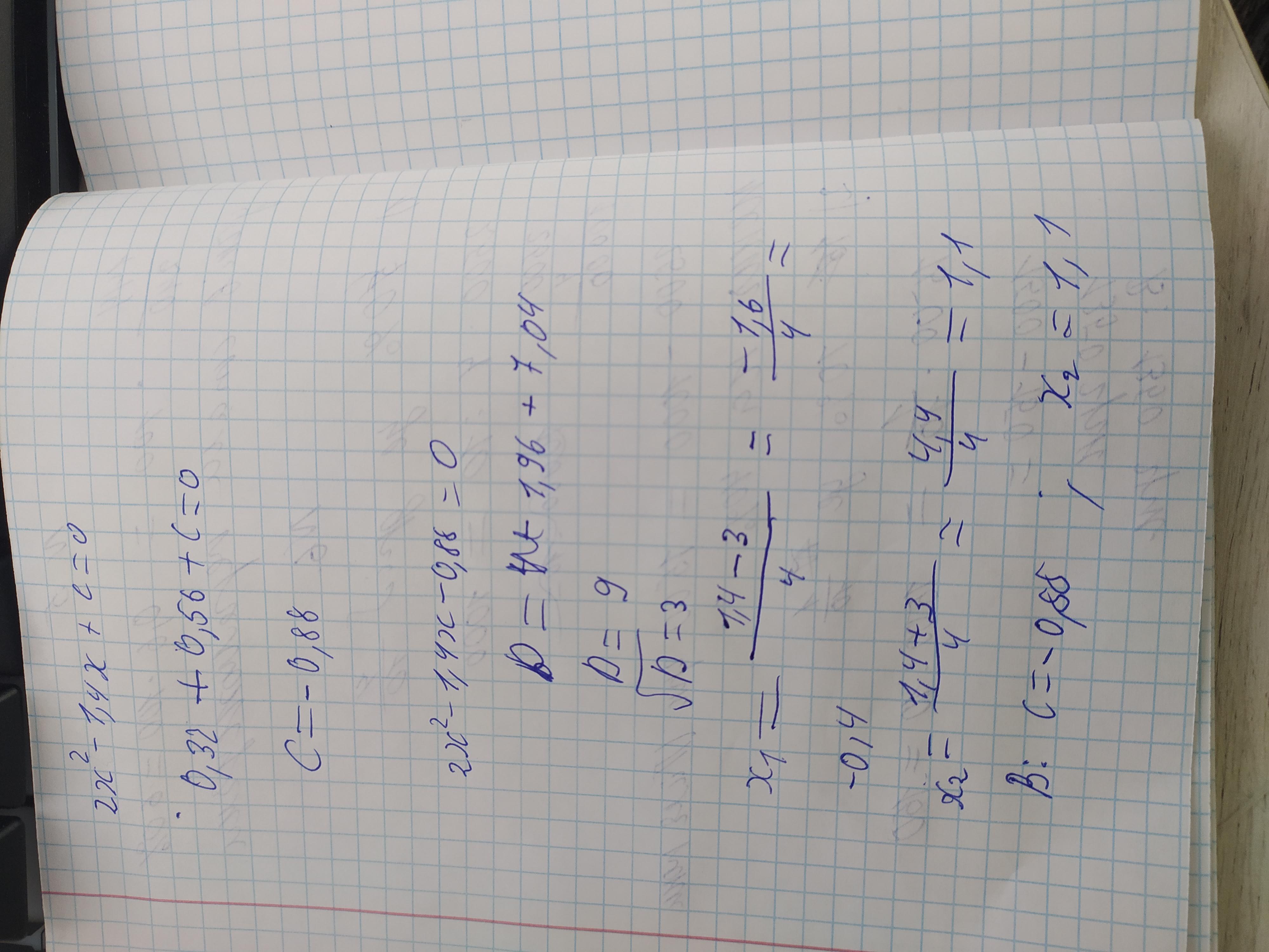 Число -0,4 є коренным рівняння 2x²-1,4x+c=0. Знайдіть значения c і другой корінь рівняння. СРОЧНО!!! ПРОШУУ!!!