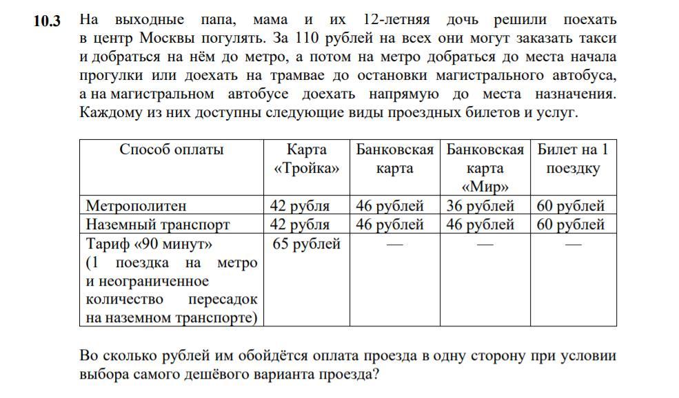 Найти во сколько рублей семье , в которой папа, мама и 12 летняя дочь, обойдётся оплата проезда в одну сторону при условии выбора самого дешёвого варианта проезда?