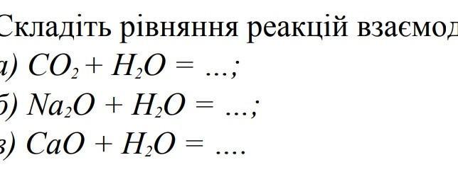 1)Со2+Н2О=2СО3;2)Na2O+H2O=NaOH;3)CaO+H2O=Ca(OH)2.
