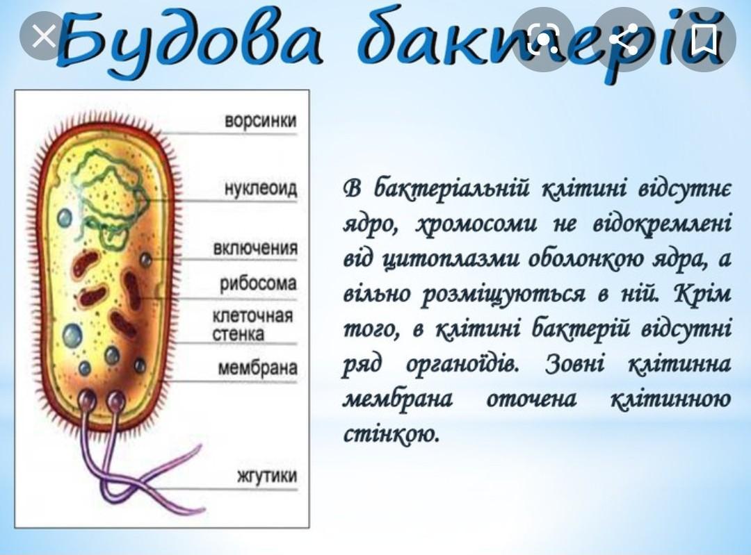 Бактерії – одноклітинні організми, які не мають ядра. Їхня форма різноманітна. Живуть у всіх середовищах.