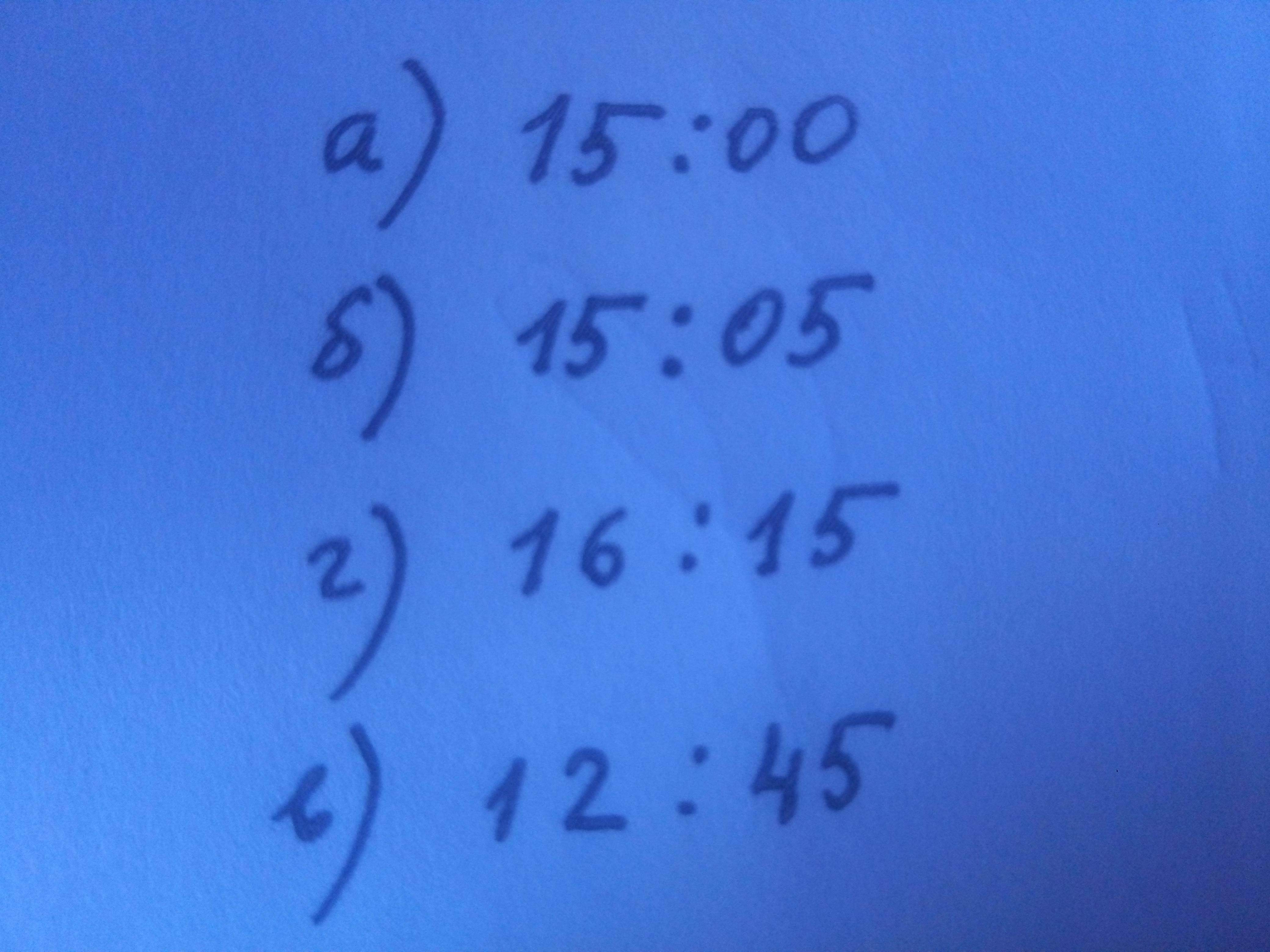 Найти угол между стрелками часов, если часы показывают время: 15:00, 15:05, 16:15, 12:45 ПОЖАЛУЙСТА