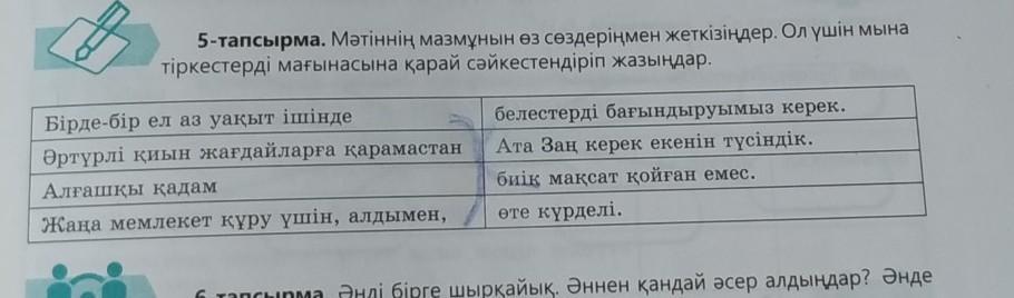 5-тапсырма. Мәтіннің мазмұнын өз сөздеріңмен жеткізіңдер. Ол үшін мына