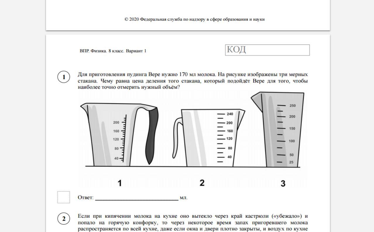 На рисунке изображены три мерных стакана. Чему равна цена деления того стакана, который подойдёт Вере для того, чтобы наиболее точно отмерить нужный объём?
