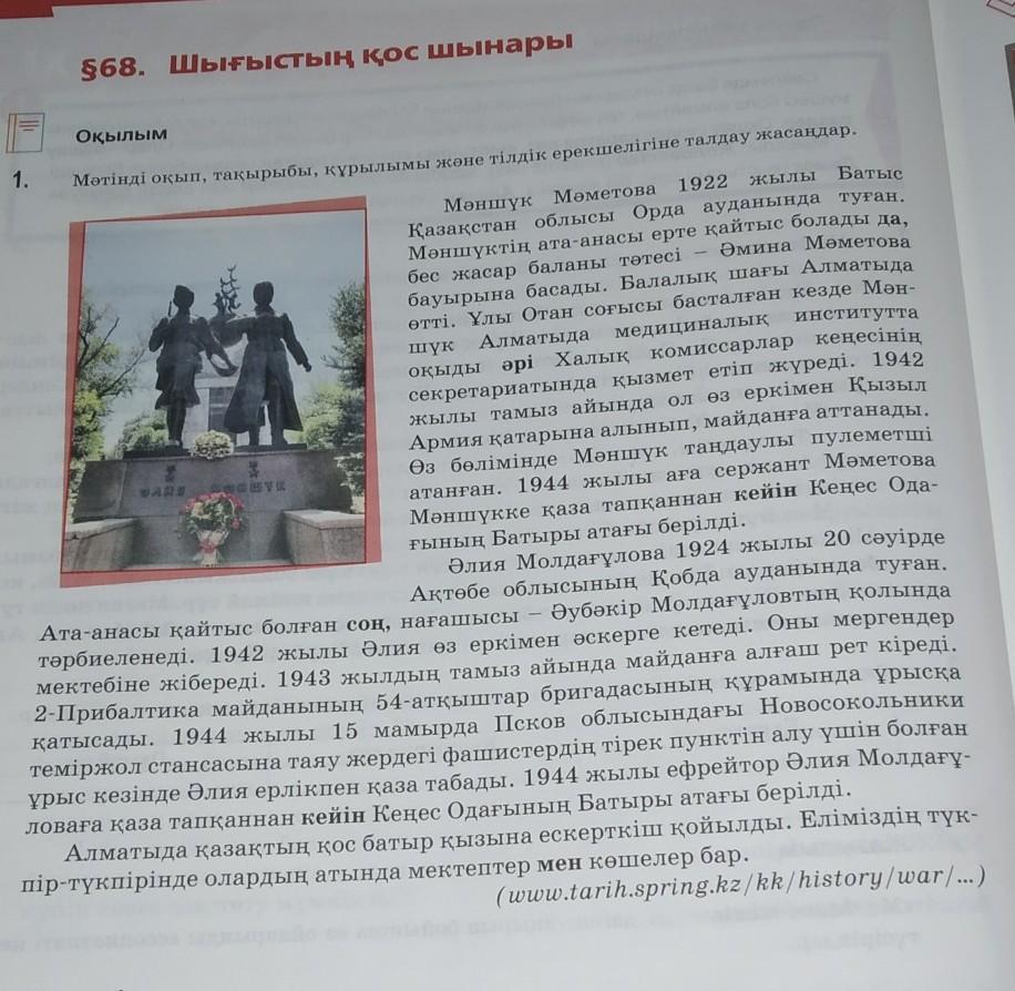 Оқылым бөліміндегі тірек сөздер мен сөз тіркестерін синонимдік қатармен ауыстырып Әлия мен Мәншүк туралы жинақы мәтін жазыңдар