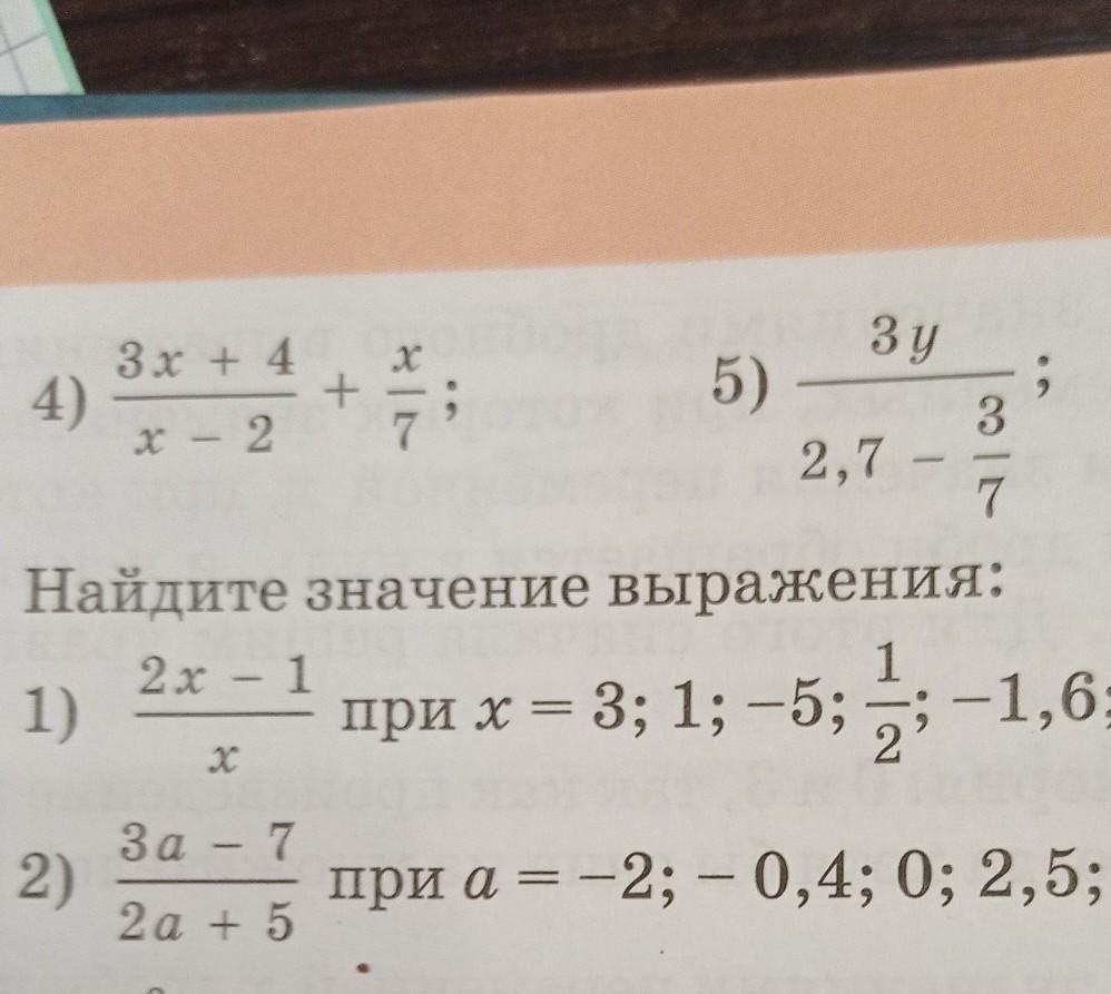 3 * (- 0,4) - 7/2 * (- 0,4) + 5 = 1,2 - 7/- 0,8 + 5 = - 8,2/4,2 = - 41/21