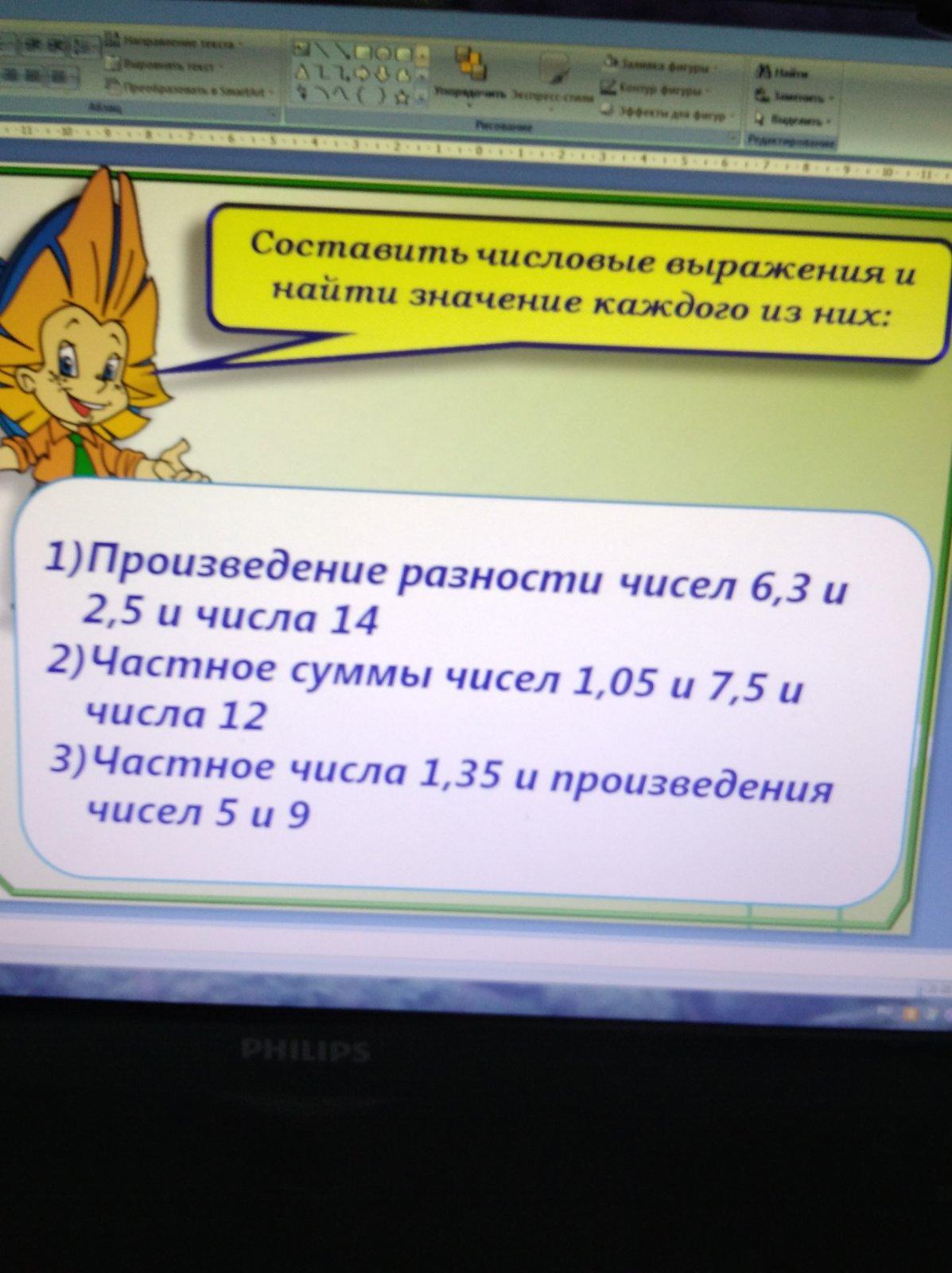 1) Произведение разности чисел 6,3 и 2,5 и числа 14. 2) Частное суммы чисел 1,05 и 7,5 и числа 12. 3) Частное числа 1,35 и произведения чисел 5 и 9.