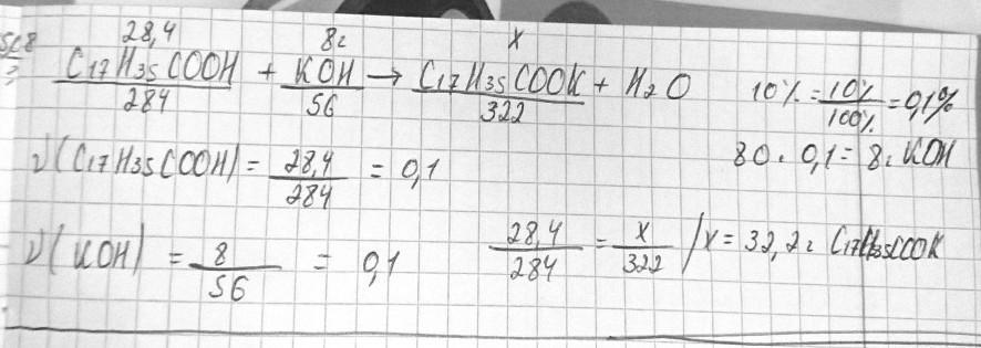 Яку масу стеарату калію можна добути внаслідок взаємодії стеаринової кислоти масою 28.4 г та розчину гідроксиду калію масою 80 г з масовою часткою KOH 10%