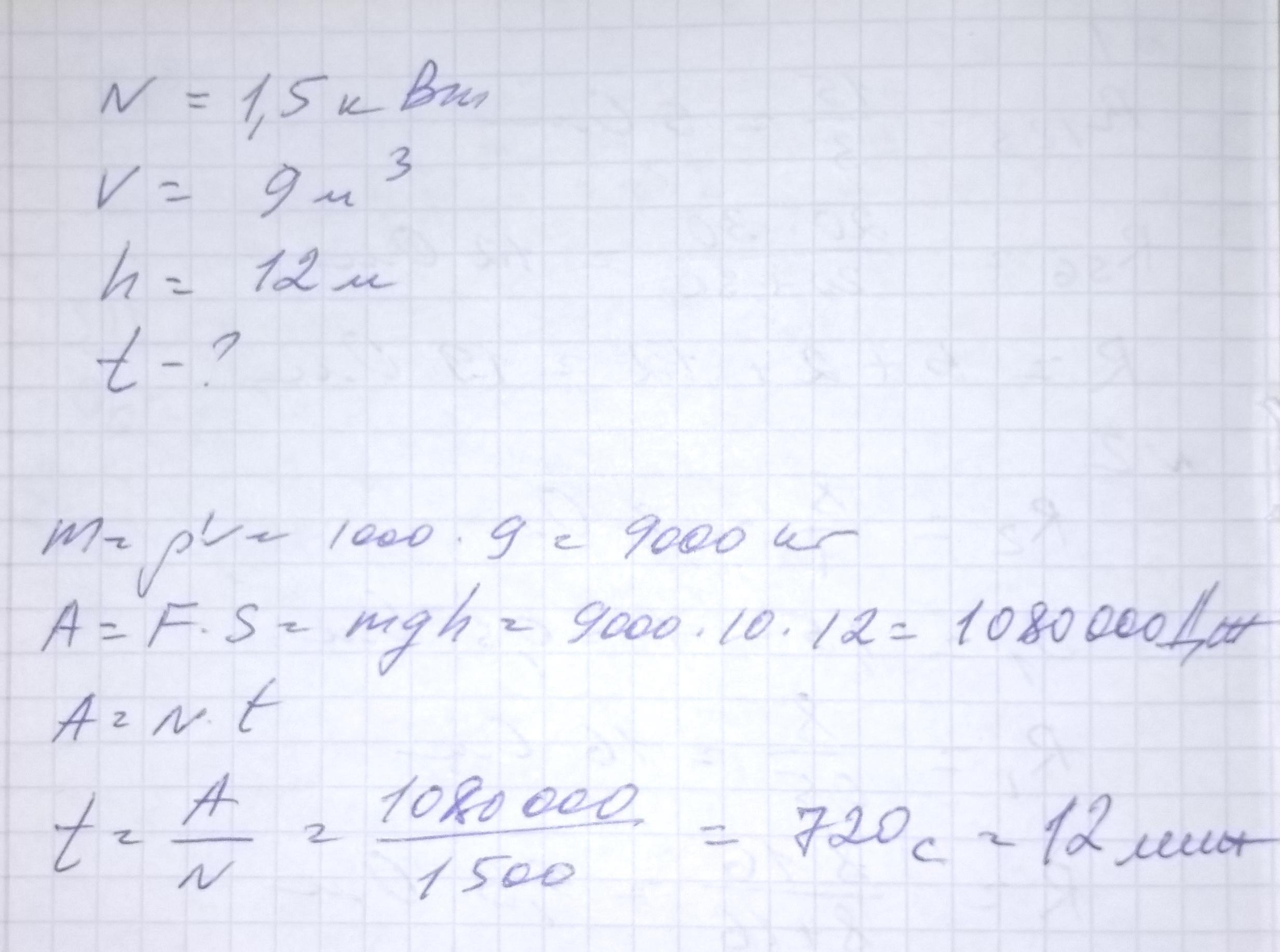 Насос мощностью 1,5 кВт откачал 9 м^3 воды из колодца глу- биной 12 м. Сколько времени работал насос?