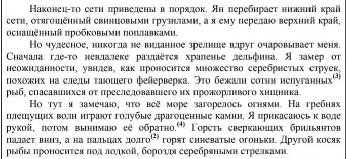 Но тут я зам..чаю, что всё море заг..релось огнями. На гребнях плещ..щих волн играют голубые драгоце(н,нн)ые камни. Я пр..к..саюсь к воде рукой потом вынимаю её обратно. (4) Горсть сверка..щих брильянтов падает (в)низ а на пальцах долго(2) г..рят нежные син..ватые огоньки. Другой косяк рыбы проносится под лодкой, бороздя серебря(н,нн)ыми стрелками