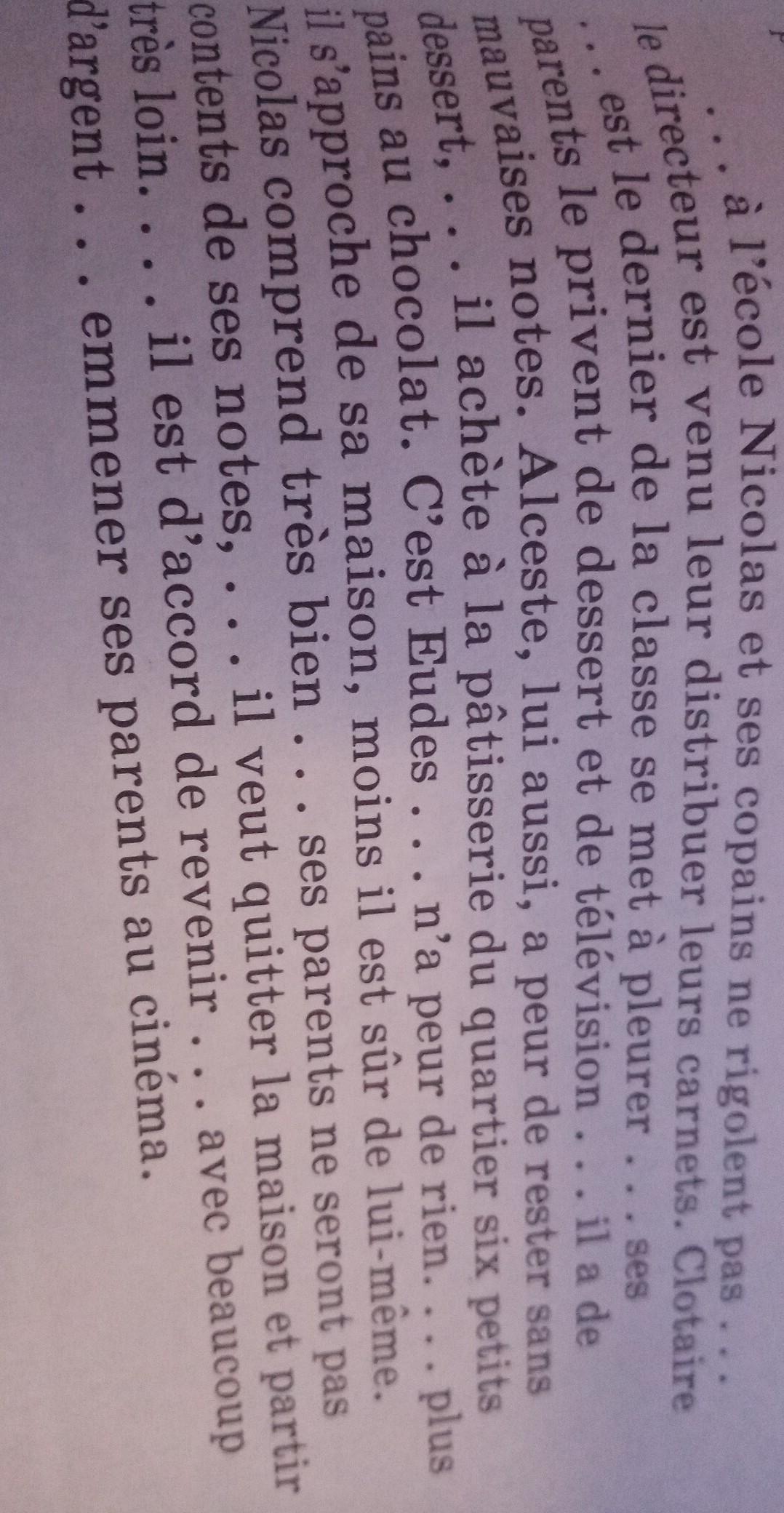 Cet après midi à l'école Nicolas et ses copains rigolent pas parce que le directeur est venu leur distribuer leurs carnets. Clotaire qui est le dernier de la classe se met à pleurer quand ses parents le privent de dessert et de télévision car il a de mauvaises notes. Alceste lui aussi a peur de rester sans dessert, c'est pourquoi il a acheté à la pâtisserie du quartier six petits pains au chocolat. C'est Eudes qui n'a peur de rien. Mais quand il s'approche de sa maison, moins il est sûr de lui même. Nicolas comprend très bien que ses parents ne seront pas contents de ses notes voilà pourquoi il veut quitter la maison et partir très loin. Mais il est d'accord de revenir dans quelques années pour emmener ses parents au cinéma.