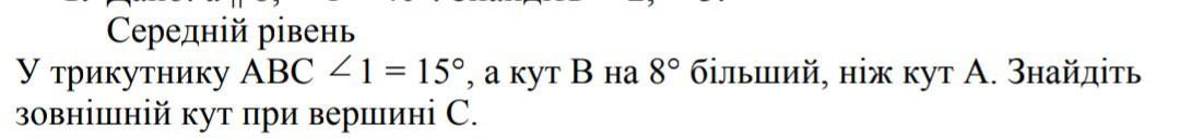 У трикутнику ABC перший кут=15⁰,а кут B на 8⁰ більший,ніж кут A.Знайдіть зовнішній кут при вершині C.
