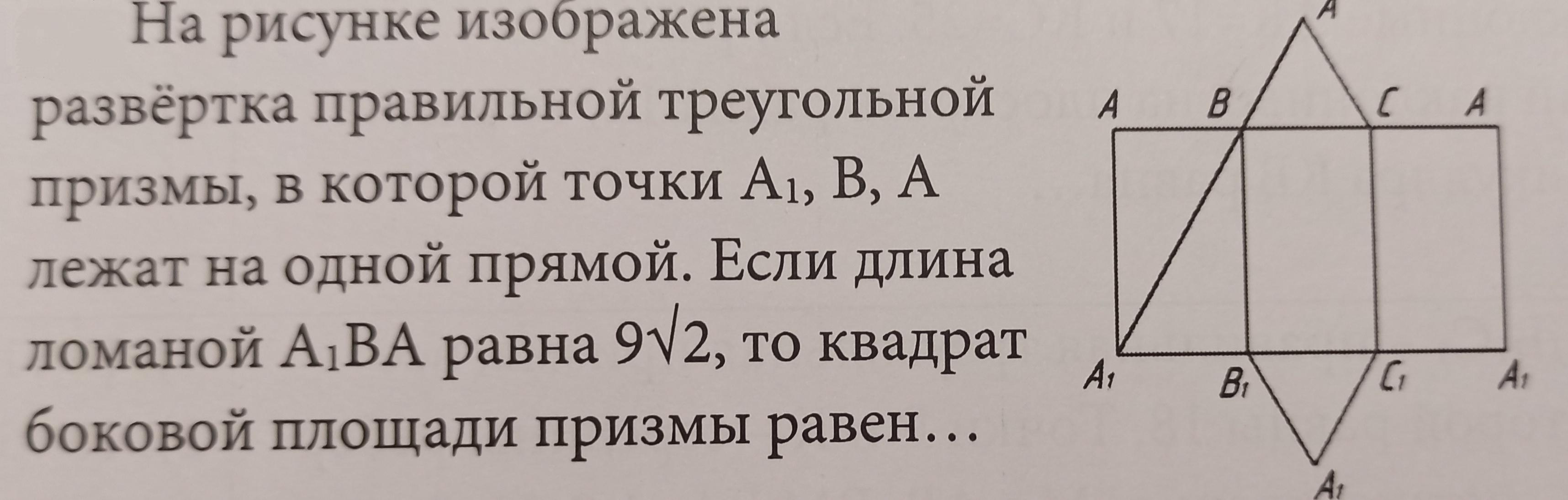 Призма правильная, значит внутренние углы треугольника в основании равны 60 градусов, тогда угол АВА1, вертикальный углу АВС, так же равен 60, тогда в прямоугольном треугольнике А1ВА сторона АВ=1/2А1В, при чем сумма этих сторон 9 корней из 2, составим уравнение, где АВ=х
