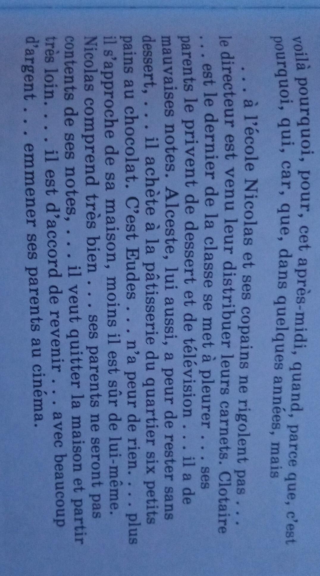 voilà pourquoi, pour, cet après-midi, quand, parce que, c'est pourquoi, qui, car, que, dans quelque années, mais
