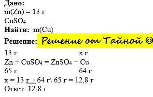 Обчисліть масу (г) міді, яку витіснить цинк масою 13 г з достатньої кількості розчину купрум(ІІ) сульфату.