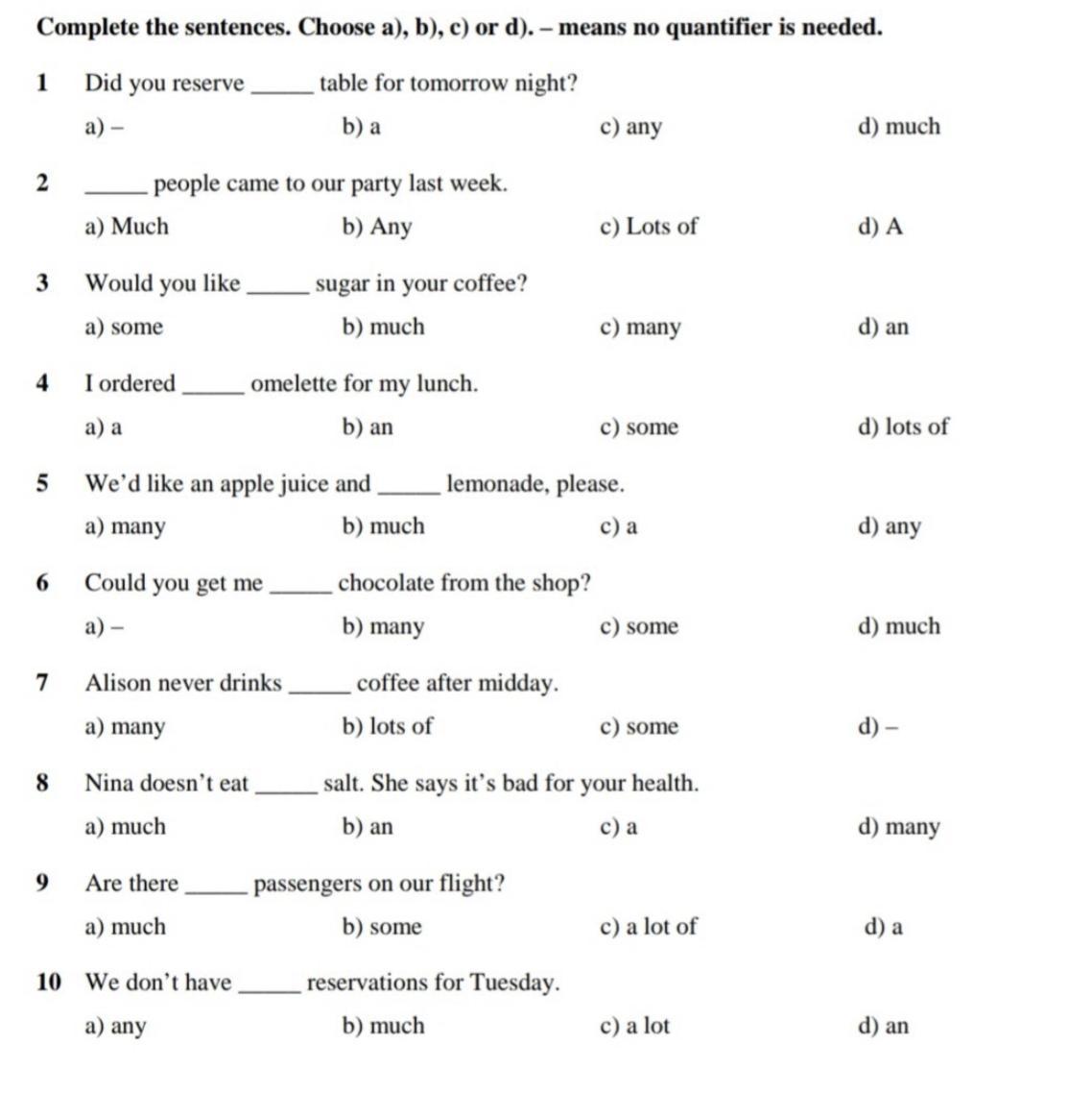 6 Could you get me, chocolate from the shop? a) - b) many c) some d) much 7 Alison never drinks coffee after midday. a) many b) lots of c) some d) -