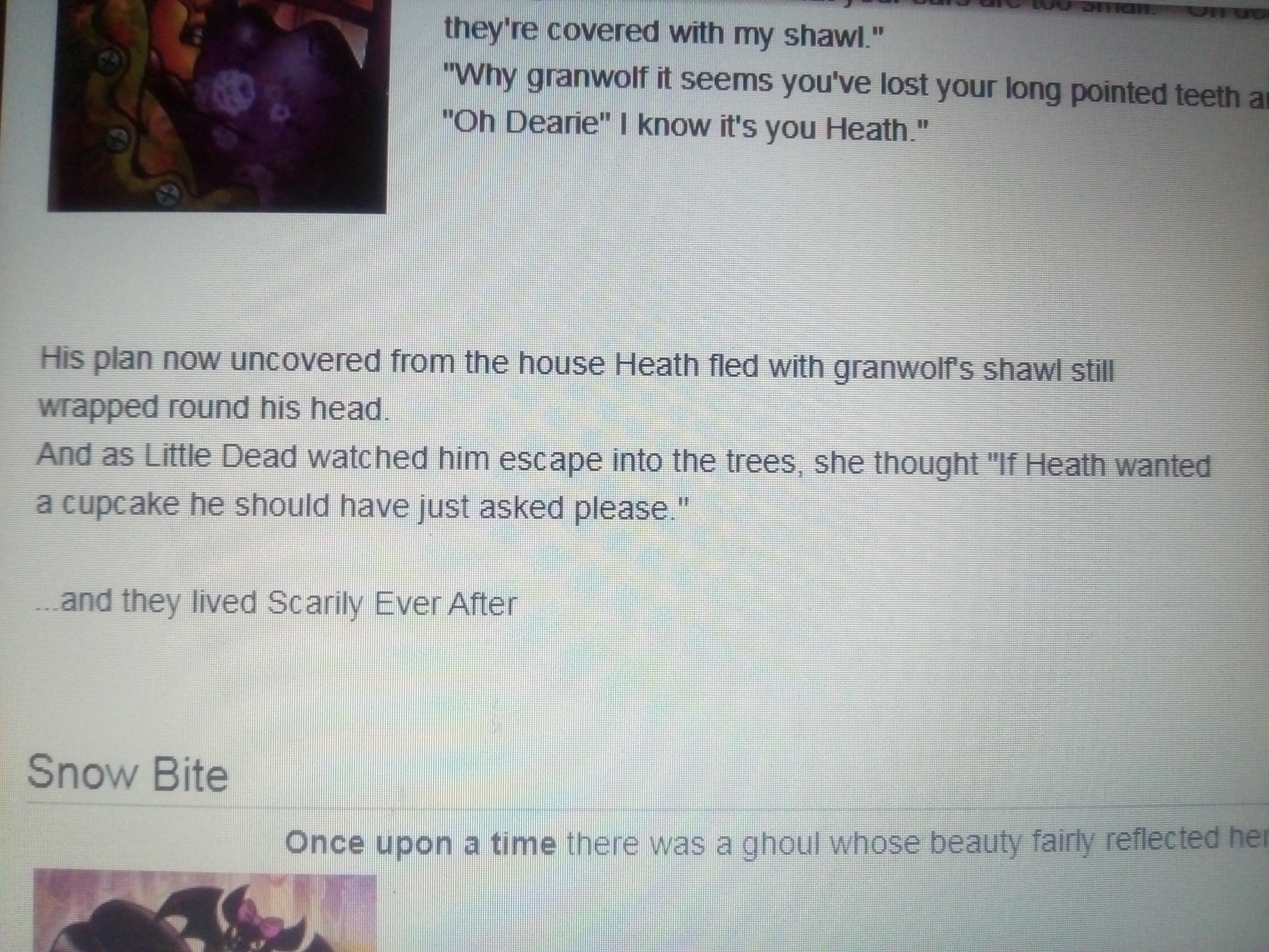 (3текст)Затем он отправился к Гранволлам этим секретным маршрутом, и он был рад обнаружить, что ее нет. Хит только что прижалась к бабушкиной кровати с балдахином, когда стук в дверь дал понять, что это, должно быть, Маленький мертвец. «Входи, - крикнул он своим лучшим рычанием гран волков, - я в лапе и слишком слаб, чтобы красться». «Просто оставь все, дорогая», - сказала ее «бабушка». «Я получу их завтра, когда встану с постели». Но нос Маленькой Мертвой сказал ей, что что-то не так, и она пошла в спальню, чтобы проверить положение бабушки.