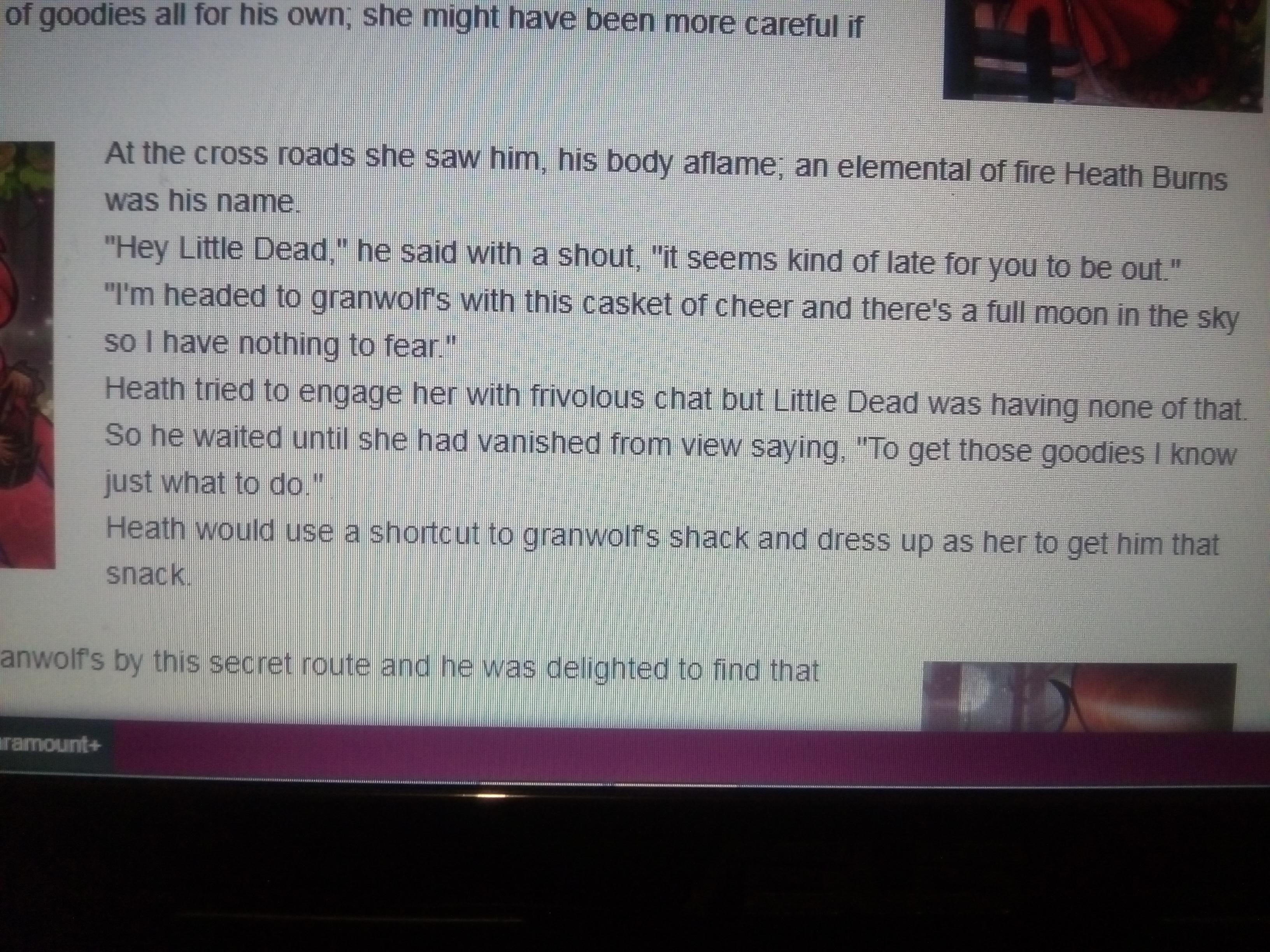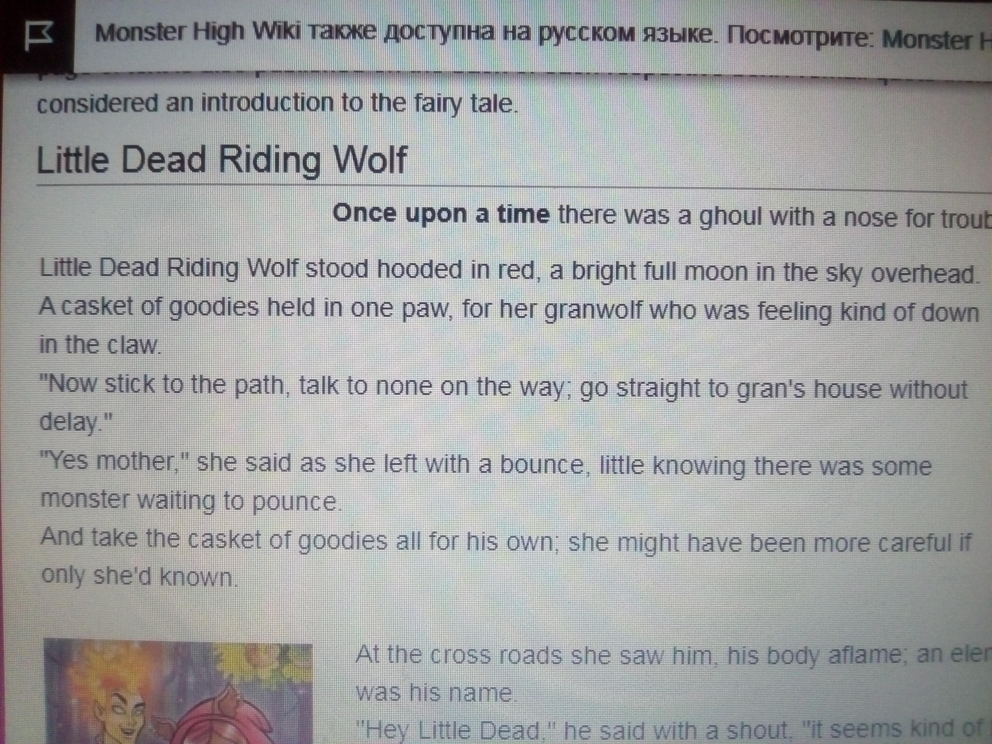 (2 текст)На перекрестке она увидела его пылающим телом; его звали элементаль огня Хит. «Привет, маленький мертвец, - сказал он с криком, - тебе уже поздно выходить». «Я направляюсь к бабушке с этой шкатулкой радости, а сейчас полная луна, так что мне нечего бояться». Хит пытался вовлечь ее в легкомысленную болтовню, но у Маленького Мертвого ничего этого не было. Поэтому он подождал, пока она не исчезла из поля зрения, говоря. «Чтобы получить эти лакомства, я просто знаю, что делать», - Хит срезал путь к лачуге бабушки и наряжался ею, чтобы угостить его закуской,