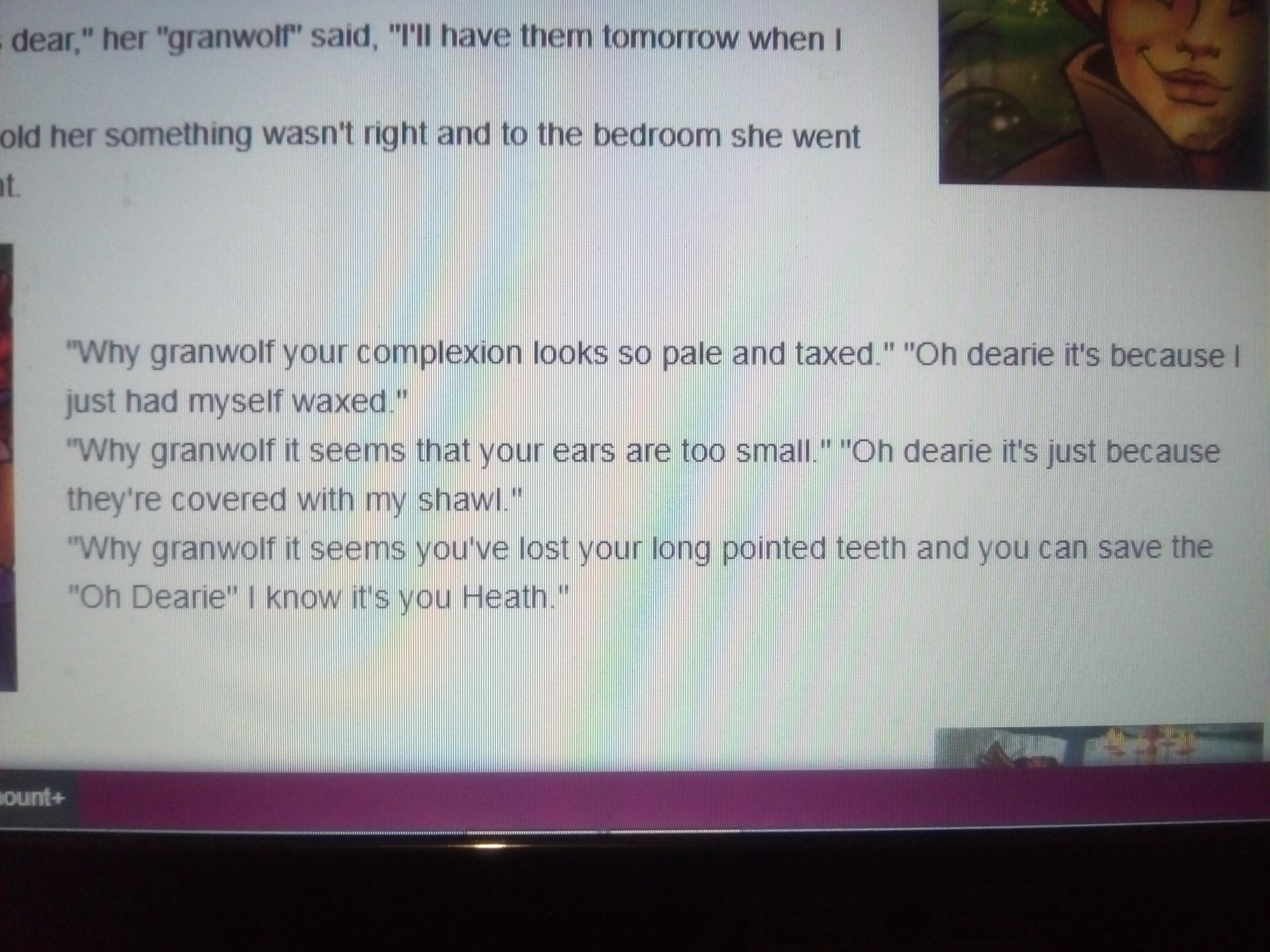 (4 текст)«Почему, бабушка, твоя кожа выглядит такой бледной и утомленной». «О боже, это потому, что я только что сделала восковую эпиляцию». «Почему, бабушка, кажется, что твои уши слишком маленькие». «О, боже, это просто потому, что они покрыты« Почему, бабушка, кажется, ты потерял свои длинные заостренные зубы и можешь спасти «О, дорогая», я знаю, что это ты, Хит ».