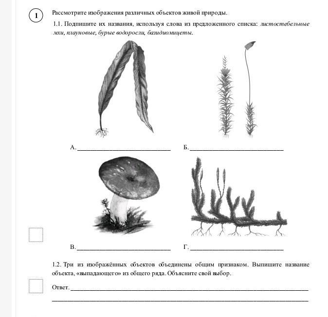 подпишите из название используя слова предложенного списка листостебельные мхи плауновые бурые водоросли базидиомицеты
