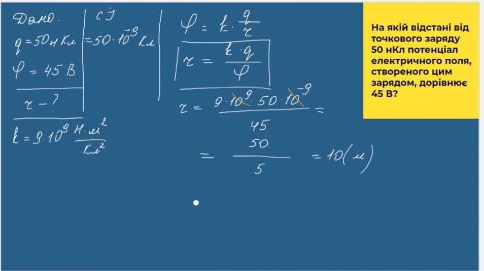 на якій відстані від точкового заряду 50 нКл потенціал електричного поля,