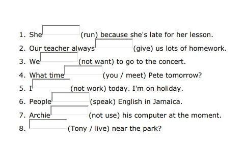1)is running 2) gives 3) don't want 4)will you meet 5) 'm not working 6) speak, 7) isn't using 8)Does Tony live