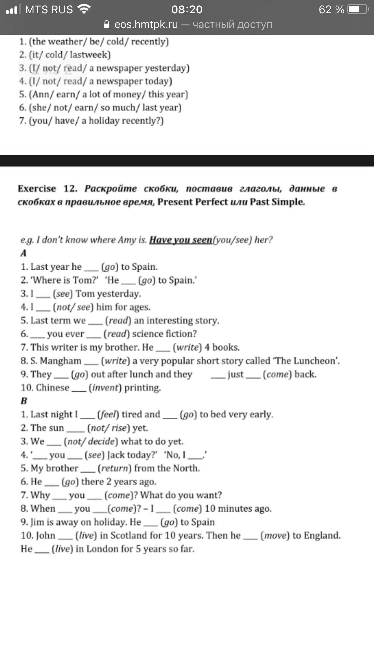 Exercise 12. Раскройте скобки, поставив глаголы, данные в скобках в правильное время, Present Perfect или Рast Simple.