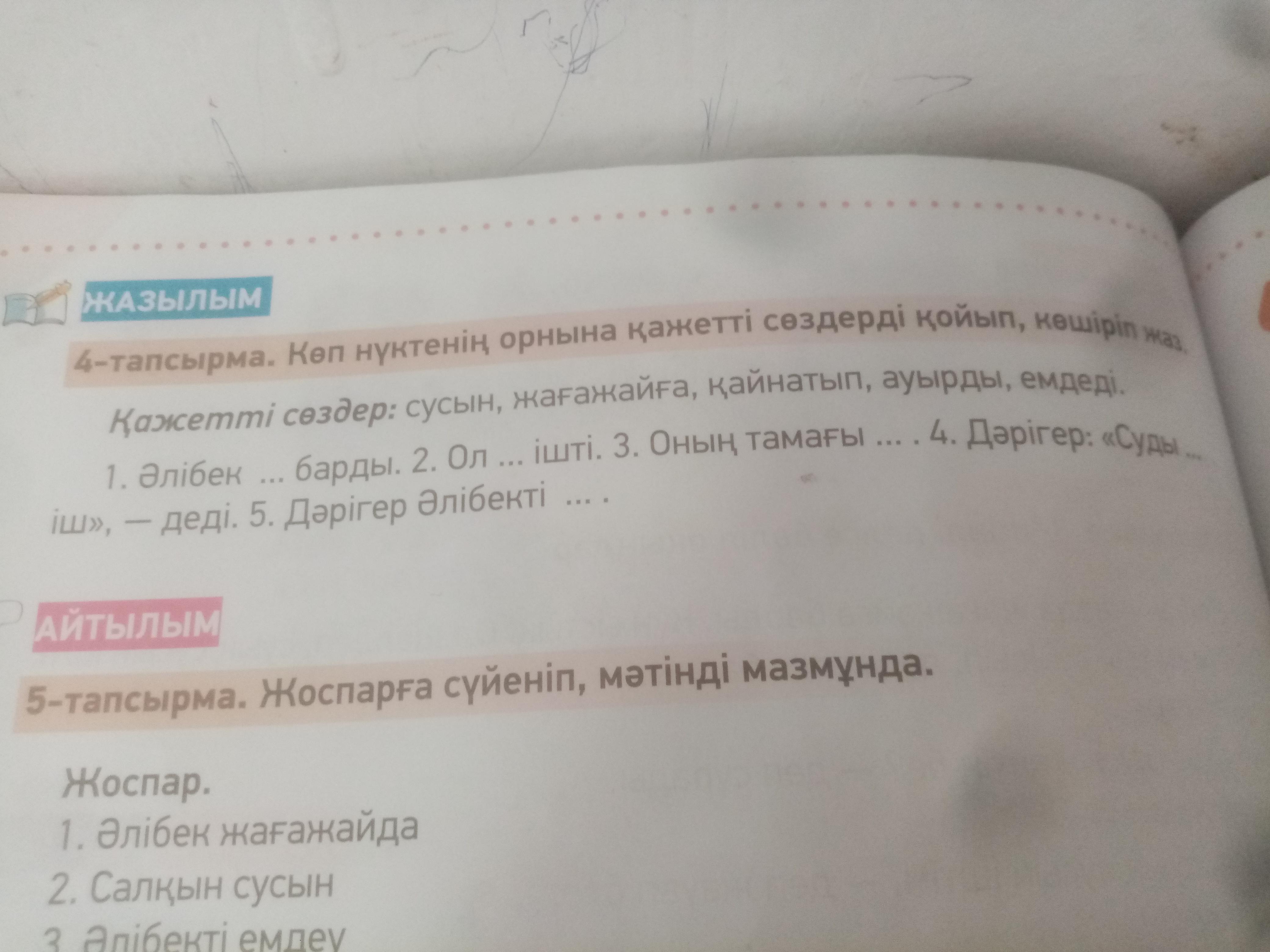 1. Әлібек жағажайға барды.2.Ол сусын ішті.3.Оның тамағы ауырды.4.Дәрігер:《Суды қайнатып іш》,-деді.5.Дәргіер Әлібекті емдеді.