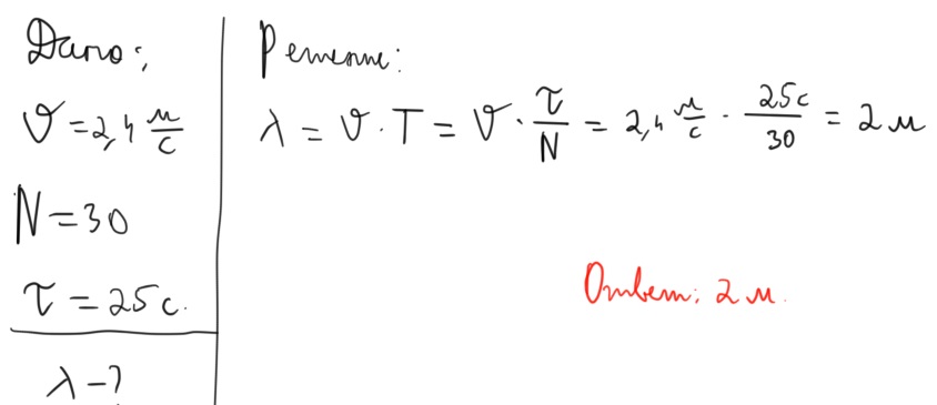Чему равна длина волны на воде, если скорость распространения волн равна 2,4м/с , а тело, плавающее на воде, совершает 30 колебаний за 25с?