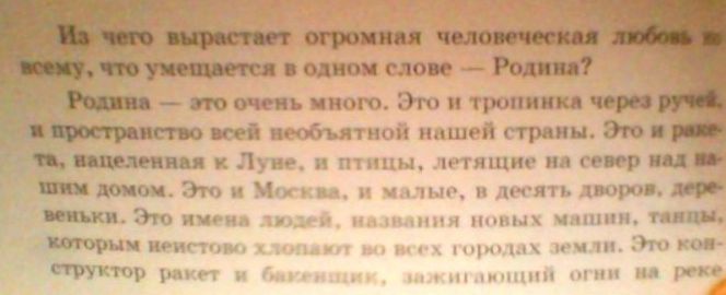 Родина – это очень много. Это и тропинка через ручей, и вся наша необъятная страна. Это космическая ракета и птицы над нашим домом. Это и Москва, и небольшие деревеньки. Это имена людей, новые машины. Это конструктор ракет и просто бакенщик на Волге. Это мой отец-машинист и твой отец-чабан.