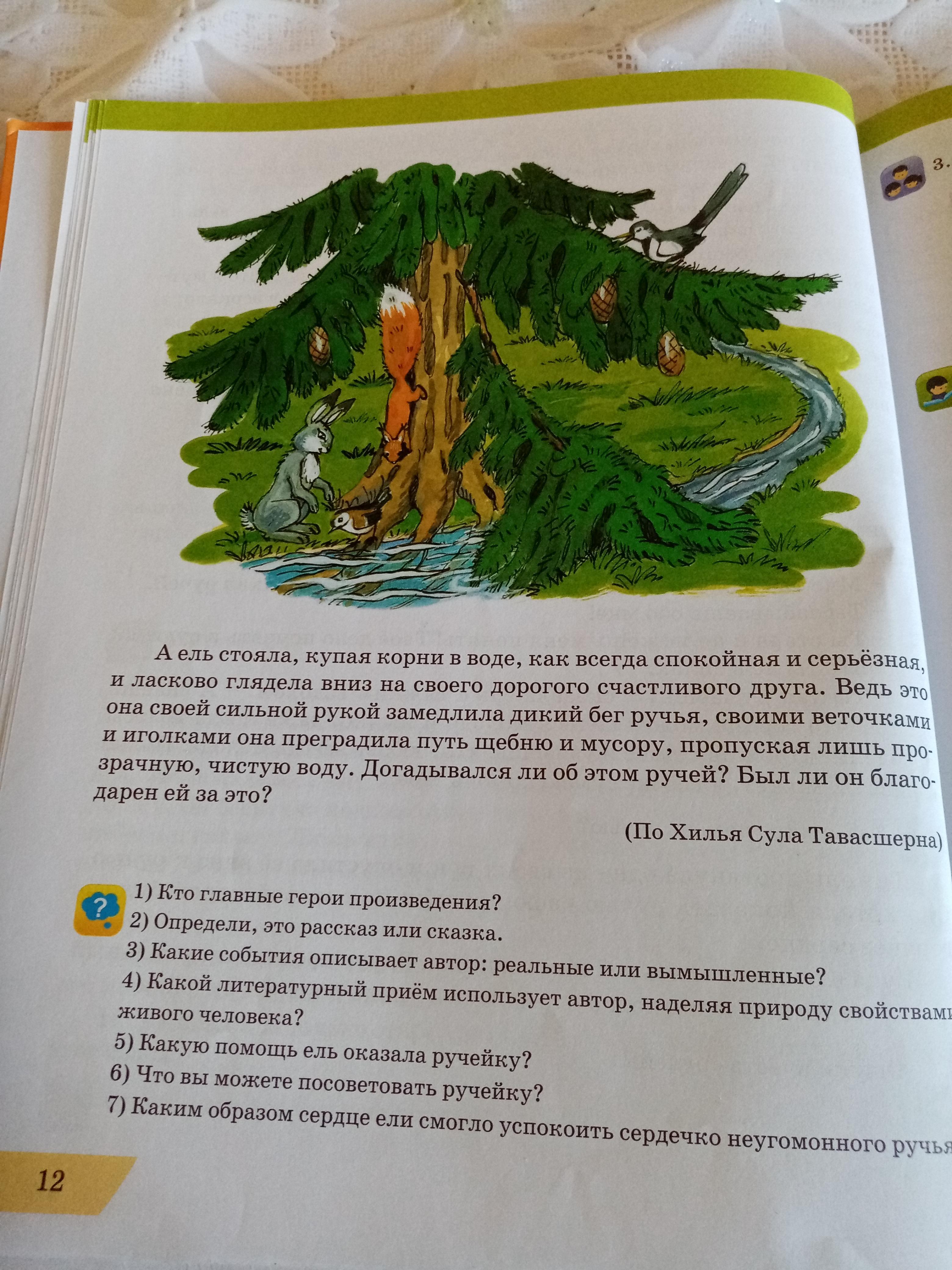 Ель:стара; добрая; готова помочь; помогла, пожалела ручей.