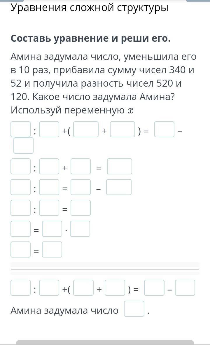 Амина задумала число, уменьшила его в 10 раз, прибавила сумму чисел 340 и 52 и получила разность чисел 520 и 120. Какое число задумала Амина? Используй переменную x