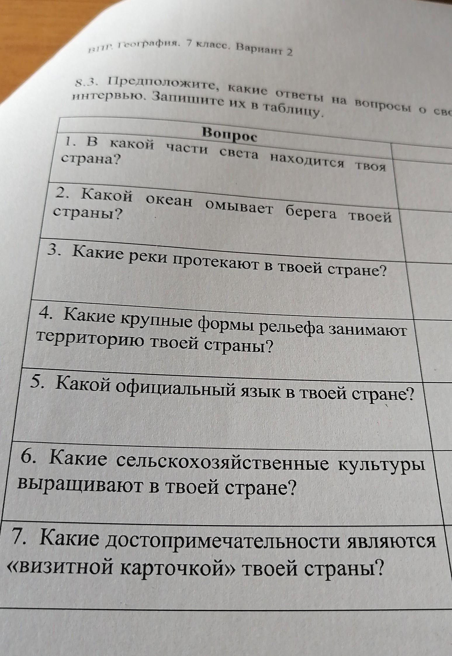 предположить какие ответы на вопросы о своей стране даст ваш сверстника в ходе интервью. Запешите их в тоблицу
