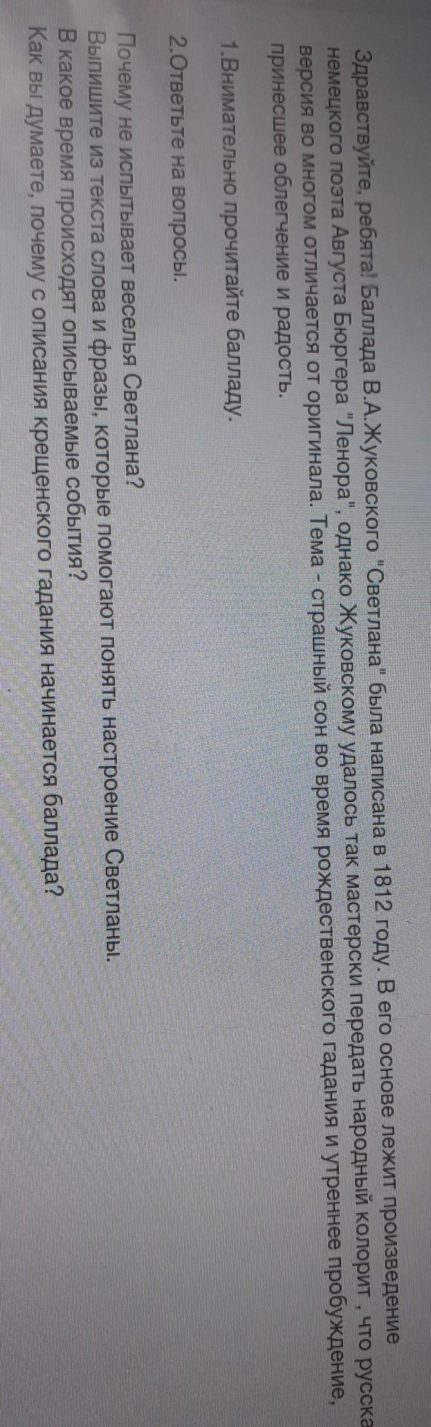 4) Автор начинает балладу с описания гаданий в ночь перед Крещением, описывает различные варианты гаданий, которым в то время девушки свято верили. У Светланы уже год жених находился в отъезде, и она не знала, что с ним. Поэтому она решила погадать и заснула.