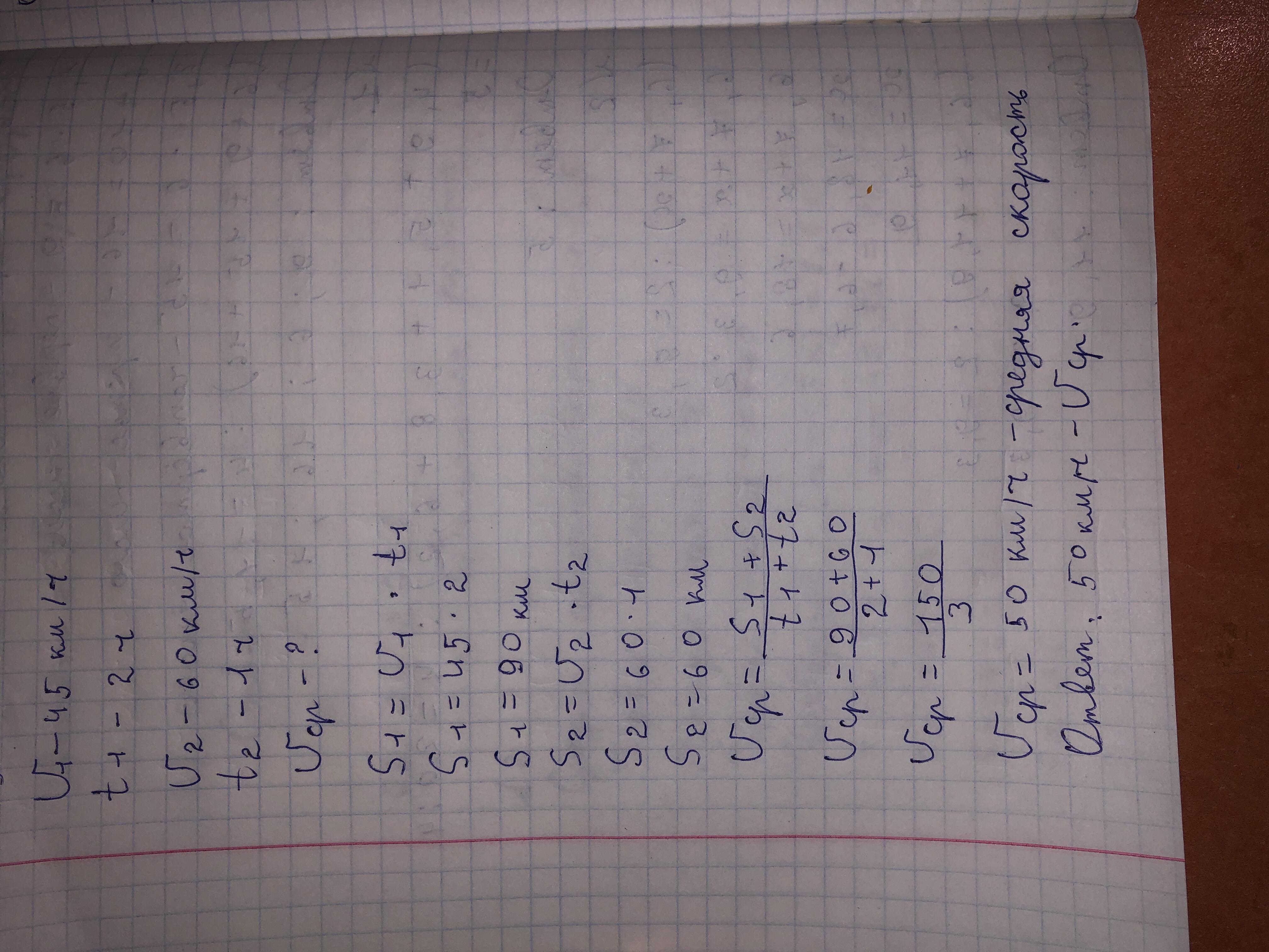 задание 3. автомобиль ехал два часа со скоростью 45 км/ч и один час со скоростью 60 км/ч. найти среднюю скорость автомобиля.