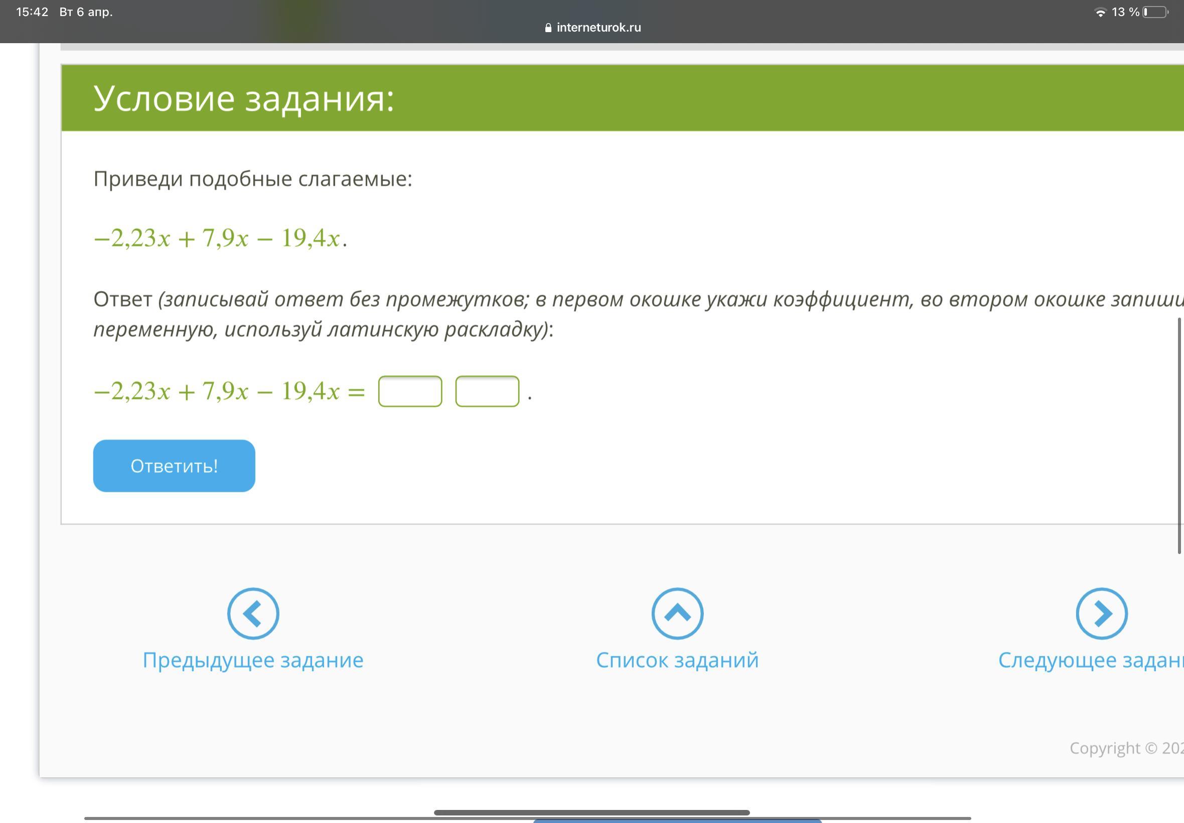 Ответ (записывай ответ без промежутков; в первом окошке укажи коэффициент, во втором окошке запиши переменную, используй латинскую раскладку):