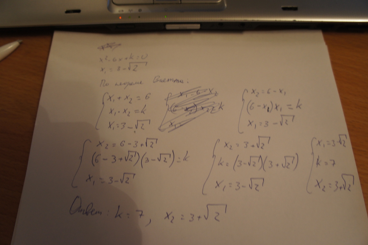 Один корень квадратного уравнения x"2-6x+k=0 равен 3-корень из 2 . Найдите другой корень и значение k .